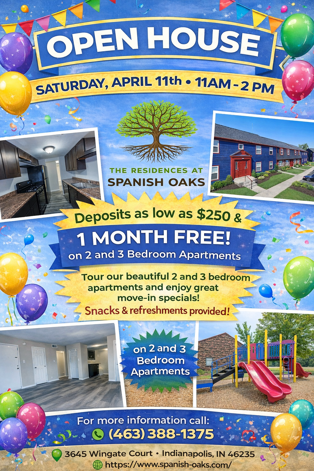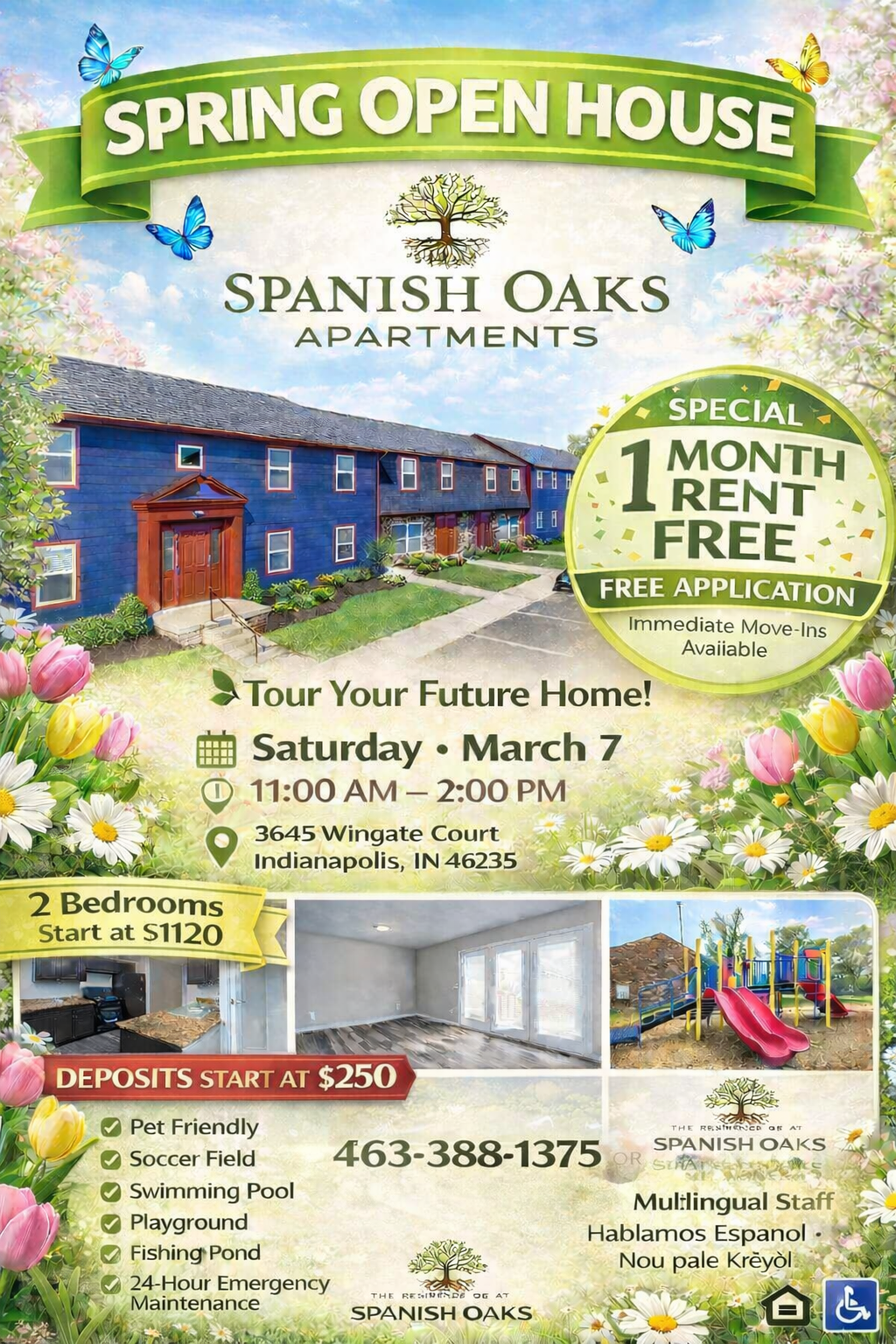 Welcome Home to Spanish Oaks Apartments in Indianapolis, Indiana. Conveniently located on Indianapolis’ east side, Spanish Oaks is just minutes away from I-465/I-70, shopping centers, various dining options & fitness facilities. With a variety of layouts & sizes, each home has an abundance of natural light with a neutral color palette that will compliment your stylish decorating taste. Our 1, 2 & 3 bedroom apartments & townhomes offer open-concept kitchens including a dishwasher & garbage disposal, ample closet space & a spacious patio or balcony. Many homes offer washer/dryer hookups, as well as oak cabinets in the kitchen & bathrooms. Stay active & enjoy the beautiful weather of Indianapolis by using one of our 2 soccer fields, playground, or splash pad. We welcome your furry friends with open arms (pet restrictions & fees may apply), offer 24-hour emergency maintenance, & friendly bilingual staff to help meet all of your needs. With numerous charter schools & a bus stop just steps away makes living at Spanish Oaks the obvious choice.